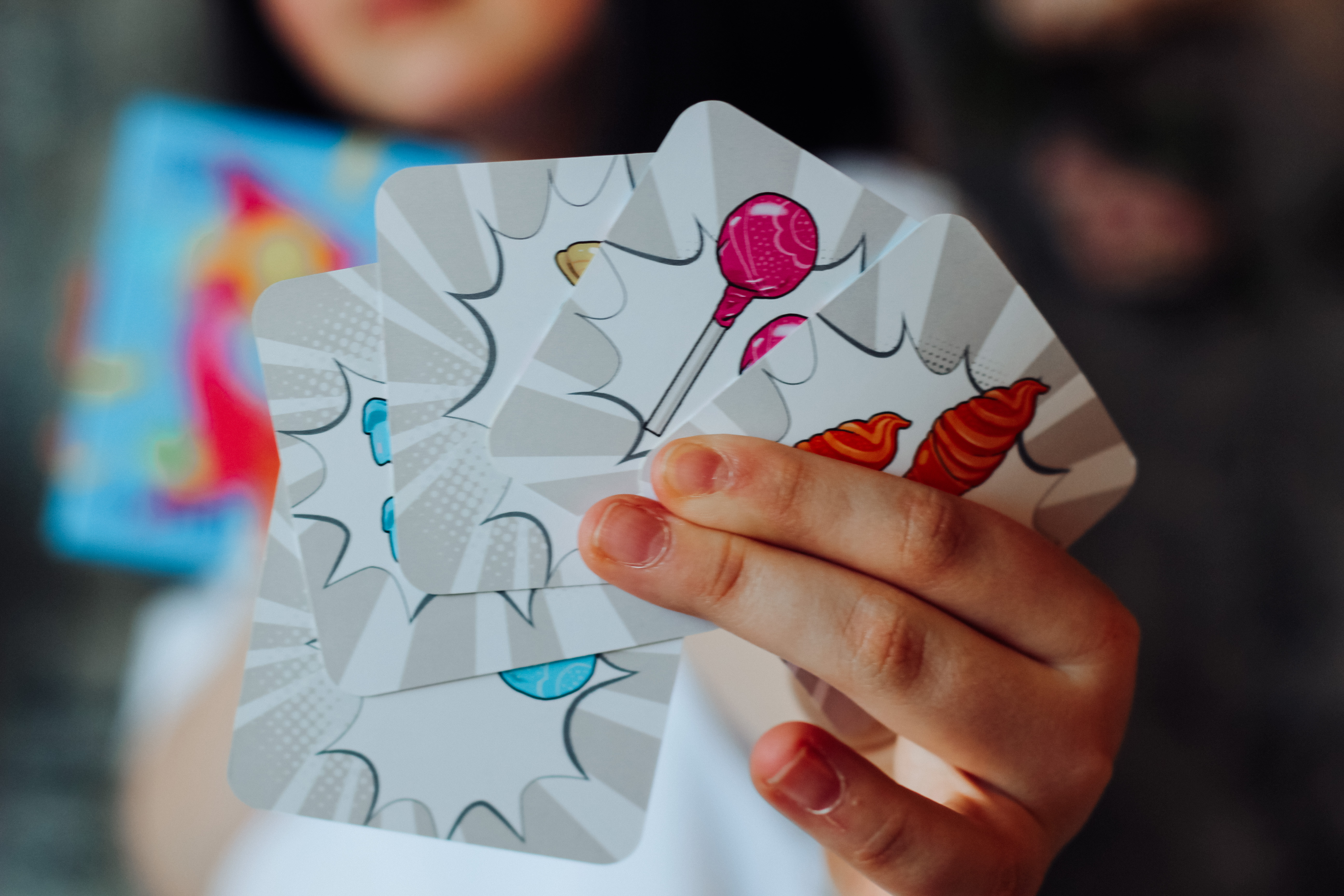 Keep track of the quantity, color, and type of sweets. Spot a match on 3 cards and name the common property—then grab the treats for your winning pile!