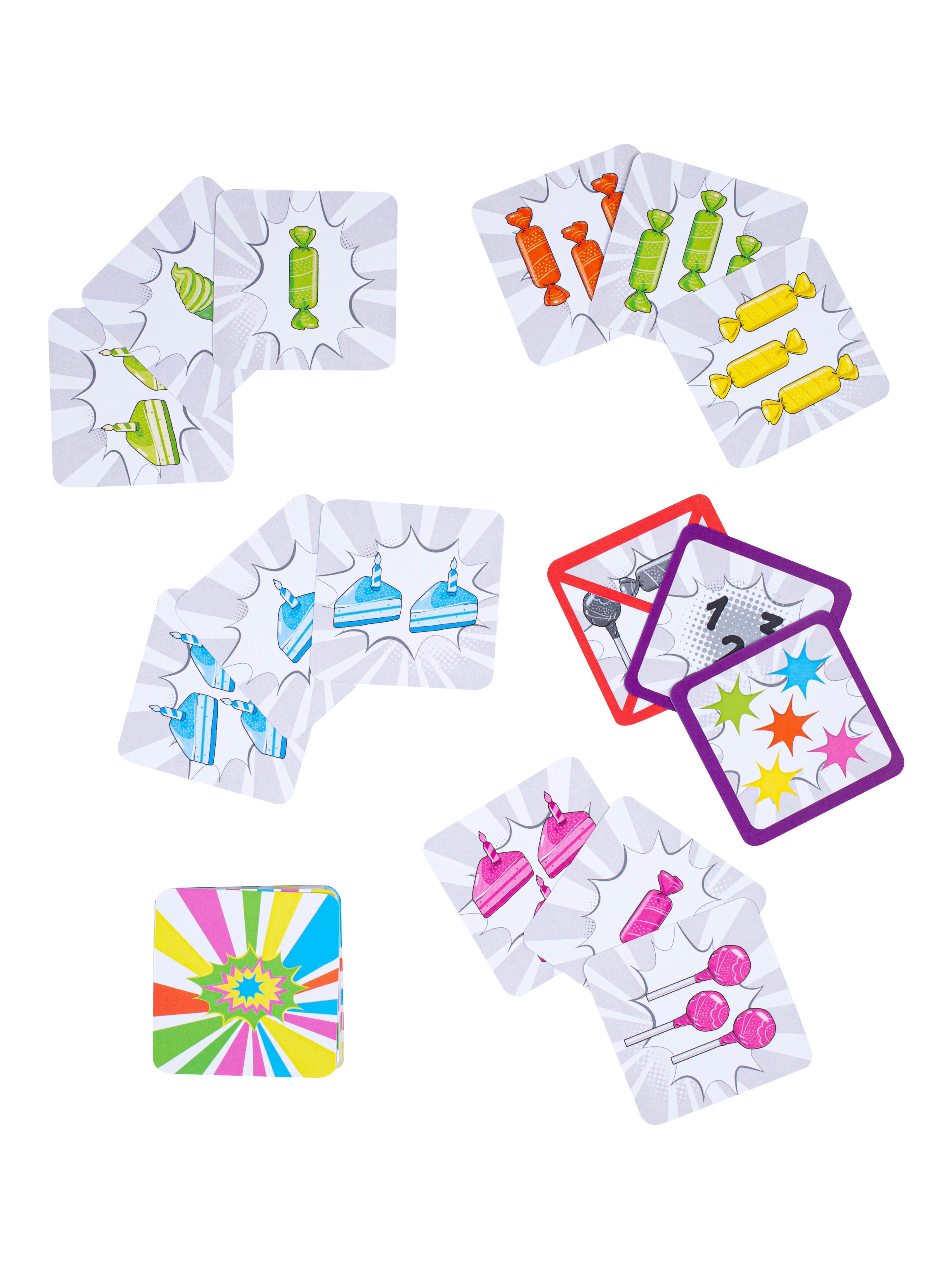 Keep track of the quantity, color, and type of sweets. Spot a match on 3 cards and name the common property—then grab the treats for your winning pile!